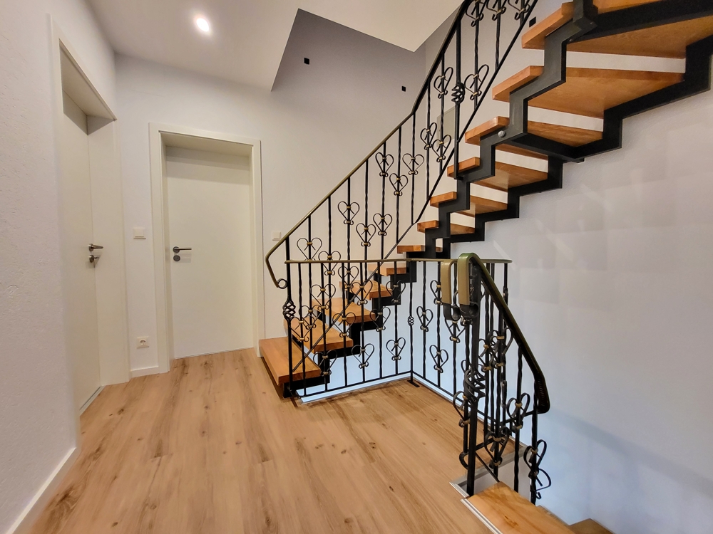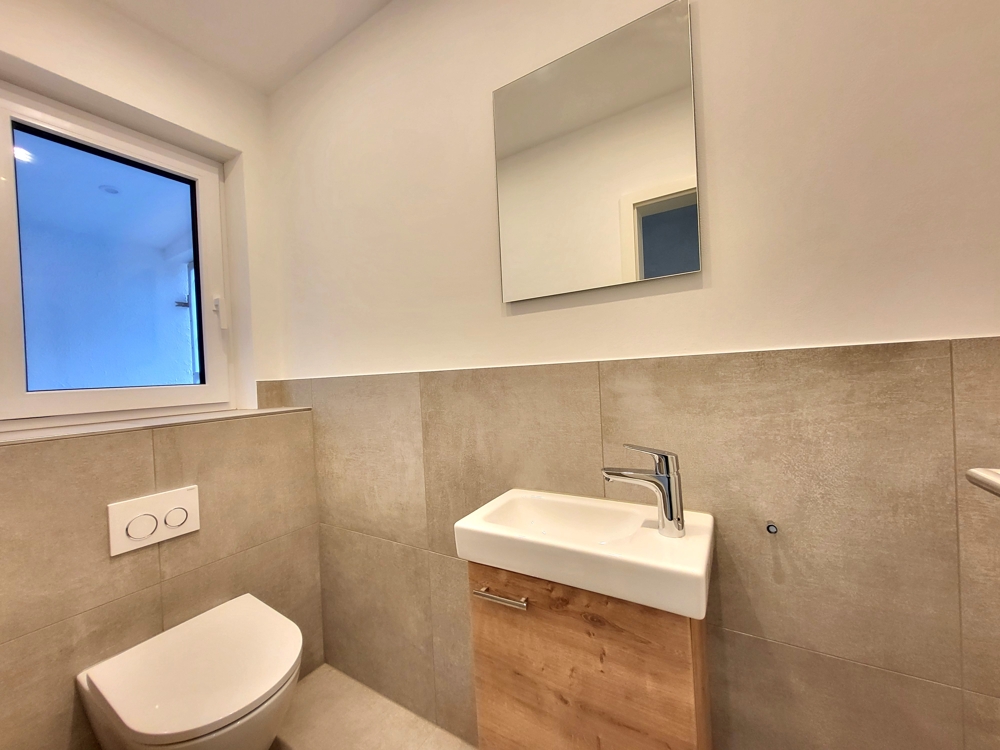 Neben einem lichtdurchfluteten Wohnzimmer finden Sie im Erdgeschoss ein an die Küche angrenzendes Esszimmer und ein Gäste-WC vor. Eine moderne Einbauküche wird installiert und ist im Mietpreis enthalten. Die große, sonnige Terrasse (neuer Belag im nächsten Jahr) ist nach Süden ausgerichtet und hat eine Markise.