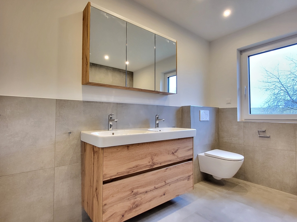 Im Obergeschoss sind neben dem Elternschlafzimmer zwei Kinderzimmer sowie ein exklusiv ausgestattetes Badezimmer mit bodengleicher Dusche und Wanne untergebracht. Im Dachgeschoss befindet sich ein weiterer großer Wohnraum.