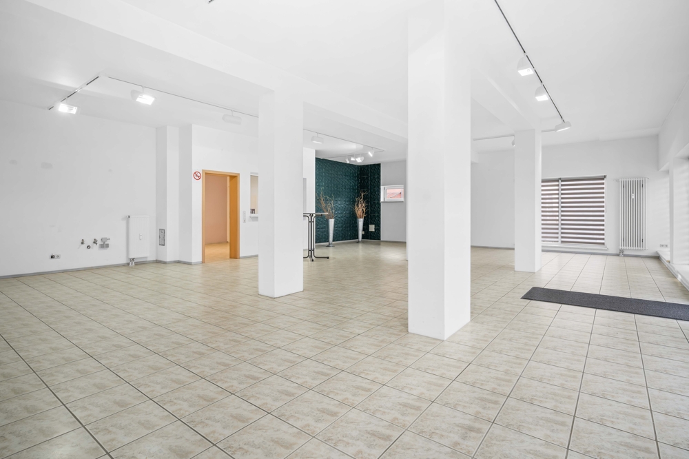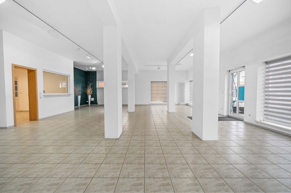 Neben einem repräsentativen, lichtdurchfluteten Showroom oder Verkaufsraum haben Sie Zugang zu einem schönen Büroraum. Ein WC finden Sie ebenfalls in der Einheit.