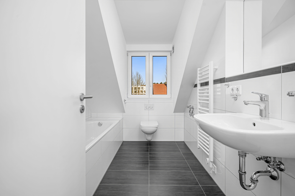 Im hell gefliesten Badezimmer finden Sie Wanne, Dusche, Waschbecken, WC und einen Waschmaschinenanschluss vor. Ein praktischer Handtuchheizkörper ist vorhanden.